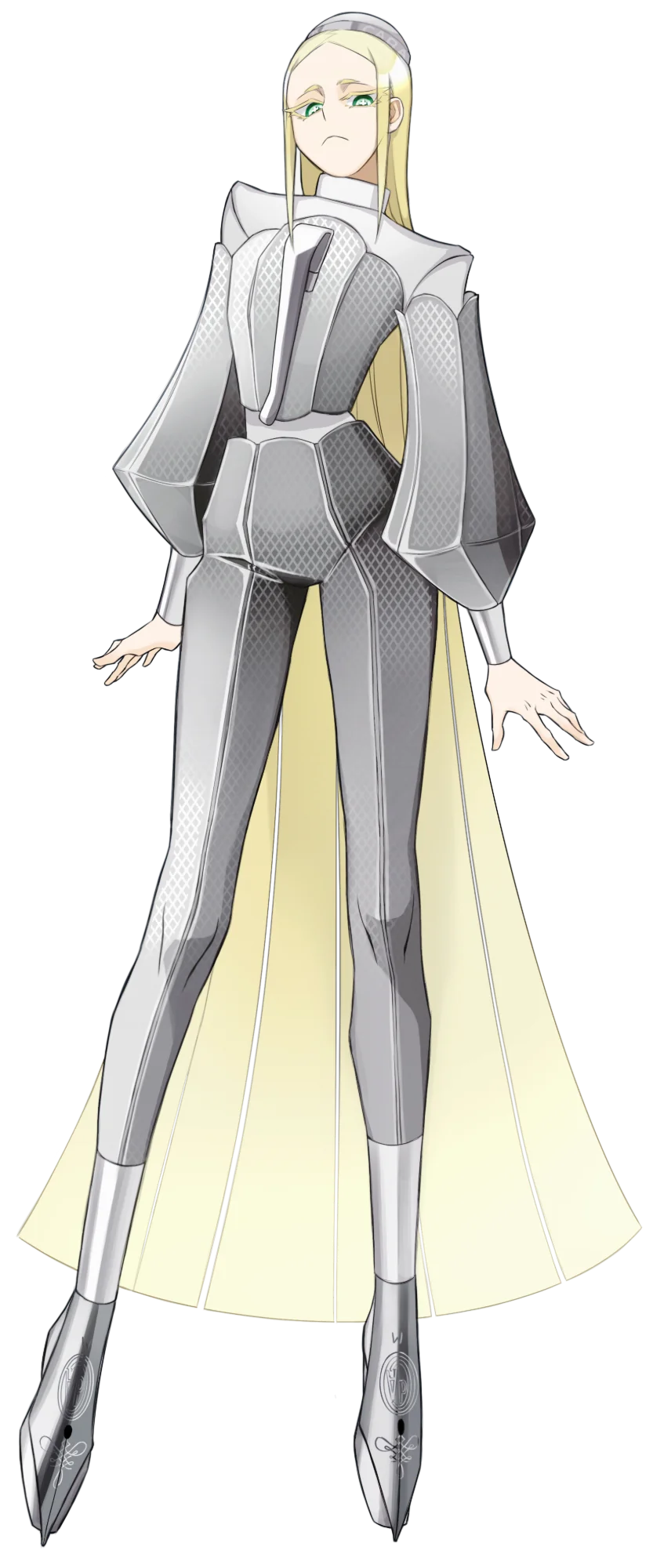 万年筆ではないですが、同モデルが軍の褒賞で贈られた・「軍で使えるペンが欲しい」という要望から開発された・といった話を読み、軍人気質・冷顔の麗人をイメージして描きました。服は本体の意匠に準拠しつつ、高貴さも感じられる形にまとめています。余談ですが、この擬人化はリメイク時に大きくデザインを変更しました。堅牢・瀟酒・直線的。